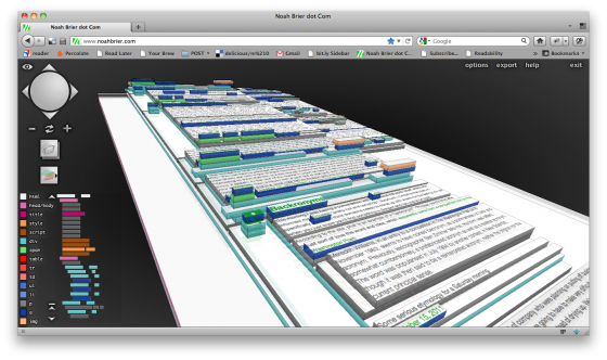 Tilt is a new Firefox plugin that lets you visualize a website in 3D. Though at first this sounds a bit insane and rather useless, being able to see the depths of various elements is actually really helpful and Tilt lets you edit inline. My mind is a bit blown.October 31, 2011
