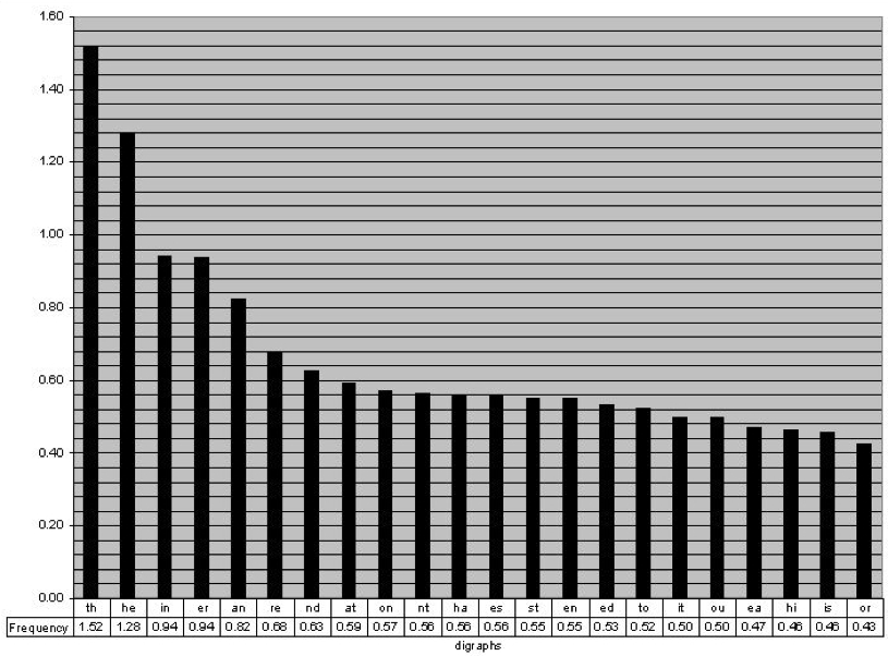 What’s wrong with that last example is that letters don’t operate independently. Let’s play a game for a second. I’m going to say a letter and you guess the next one. If I say “T” the odds are most of you are going to say “H”. That makes lots of sense since “the” is the most popular word in the English language. So instead of just picking letters at random based on probability what Shannon did next is pick one letter and then match it with it’s probabilistic pair. These are called bigrams and just like we had letter frequencies, we can chart these out.