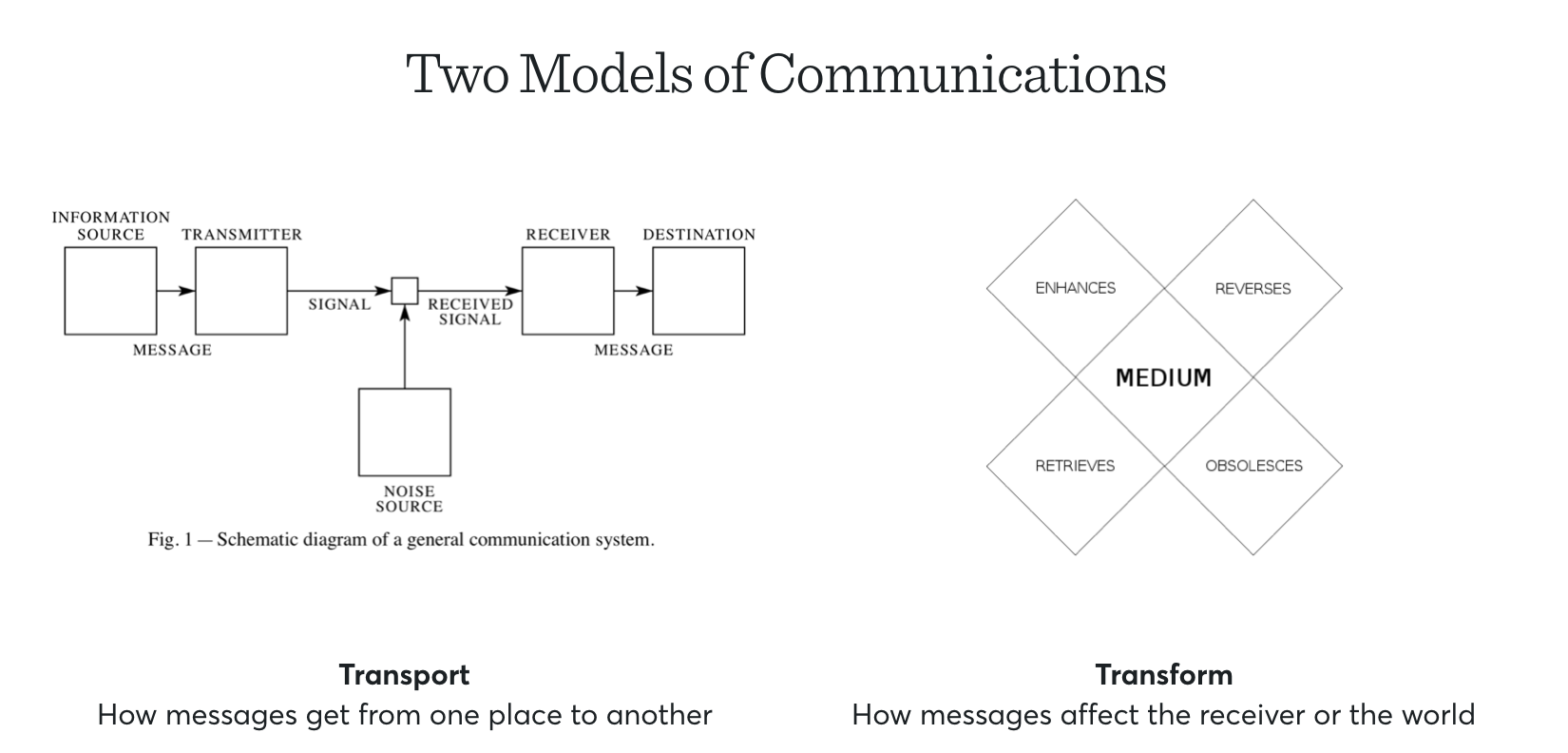 Shannon and McLuhan were two of the most important thinkers of the 20th century. Without Shannon we'd have no computers and without McLuhan we wouldn't examine the effects of media, communications, and technology on society with the urgency we do. With that said, they're very different in their science and approach. Shannon was fundamentally a mathematician while McLuhan was a scholar of literature. In their work Shannon examined huge questions around how communications works technically, while McLuhan examined how it works tactically. When asked, McLuhan drew the distinction as questions of "transportation" versus "transformation":