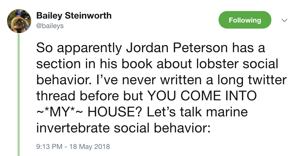Like everyone else I enjoyed the Jordan Peterson takedown profile from the New York Times. Lobster Twitter was not happy with Mr. Peterson's adoption of their favorite crustacean: