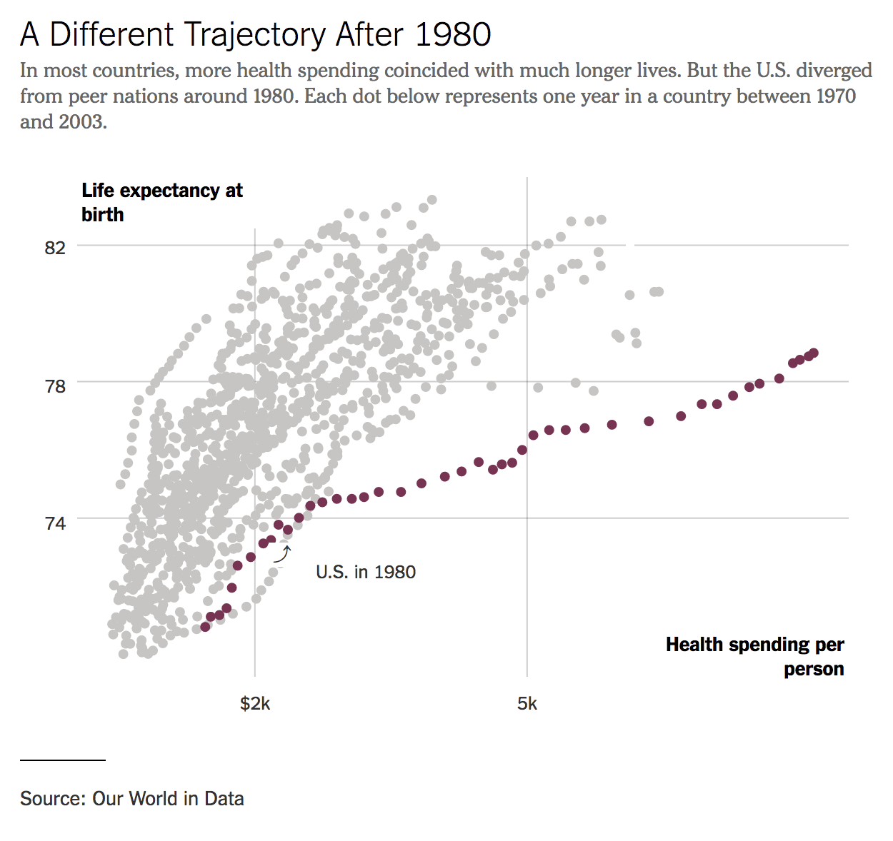 And Samuel bought newspapers, and preachers, too. He gave them this simple lesson to teach, and they taught it well: Anybody who thought that the United States of America was supposed to be a Utopia was a piggy, lazy, God-damned fool. Samuel thundered that no American factory hand was worth more than eighty cents a day. And yet he could be thankful for the opportunity to pay a hundred thousand dollars or more for a painting by an Italian three centuries dead. And he capped this insult by giving paintings to museums for the spiritual elevation of the poor. The museums were closed on Sundays.Some "Restaurant Recommendations from Your College Friend". What happened to medical spending in the US in 1980?
