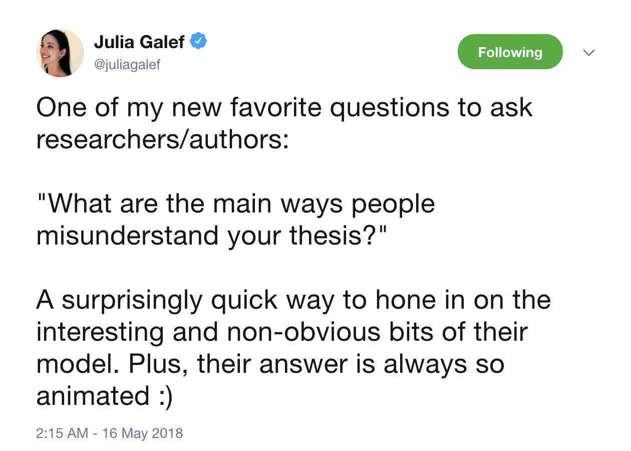 And speaking of Julia Galef, I really liked this Tweet of hers:The weakness of the book is that it doesn’t seriously consider the second part of the conversation—the human values that the young woman from the small town talks about. Our local, particular connections to just one specific family, community, place, or tradition can seem irrational. Why stay in one town instead of chasing better opportunities? Why feel compelled to sacrifice your own well-being to care for your profoundly disabled child or fragile, dying grandparent, when you would never do the same for a stranger? And yet, psychologically and philosophically, those attachments are as central to human life as the individualist, rationalist, universalist values of classic Enlightenment utilitarianism. If the case for reason, science, humanism, and progress is really going to be convincing—if it’s going to amount to more than preaching to the choir—it will have to speak to a wider spectrum of listeners, a more inclusive conception of flourishing, a broader palette of values.