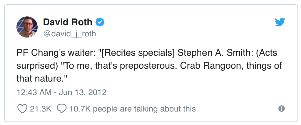 Last, but not least, who doesn't want to read a profile of sports-mouth(???) Stephen A. Smith? Also, if you haven't already , go and read The Awl on Stephen A., which includes the canonical Stephen A. Smith parody tweet (for those that haven't heard him before, he has an uncanny ability to get himself into a frenzy about anything and a willingness to always take the other side):