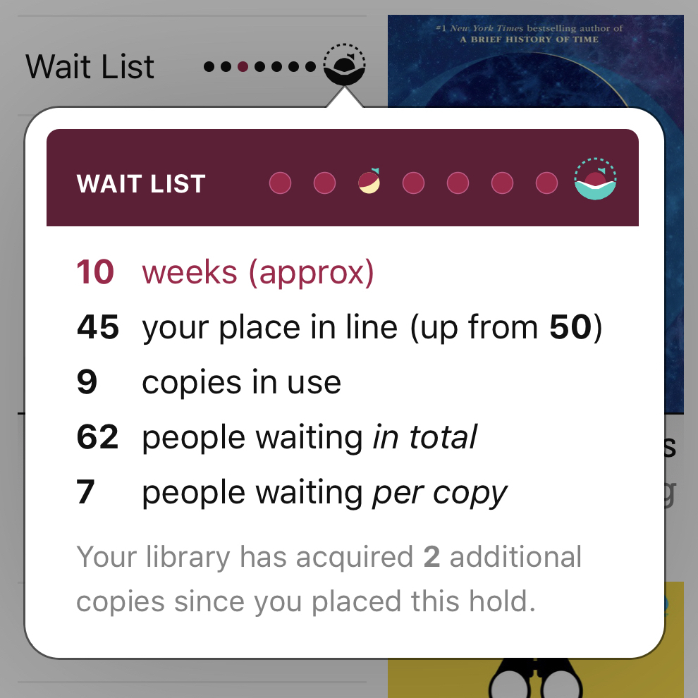When I've told people about my library habits I've gotten two reactions: There's a group who is amazed that you can borrow Kindle books and promises to immediately go out and get themselves a card and there's another who tells me they tried it, but the borrowing just didn't work for them. They can never find books they want, they explain, and when they do finally find a good ebook to borrow, they are always on hold. I can't say much about not finding books you want except that I've managed to find lots books this year that were both well worth reading and immediately available. But that's not the point of this post. I want to talk about book holds and how they're better thought of as a feature of the library, not a bug. Let me explain.