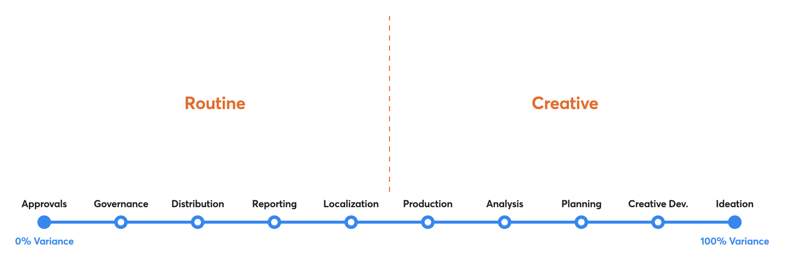 But that's just the first layer. Like so many parts of an organization (and as described in my essays on both The Parable of Two Watchmakers and Conway's Law), companies are hierarchical and at any point in the spectrum you can drill in and find a whole new spectrum of activities that range from low variance to high variance. That is, while finance may be "low variance" on average thanks to government standards, forecasting and modeling is most certainly a high variance function: Something that must be imagined in original ways depending on a number of variables include the company, and its products and markets (to name a few). Zooming in on marketing we find a whole new set of processes that can themselves be plotted based on the variance of their output, with governance far to the low variance side and creative development clearly on the other pole. Another way to articulate these differences is that the low variance side represents the routine processes and the right the creative.