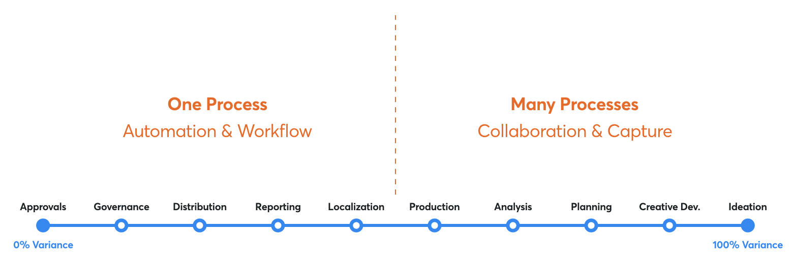 The vast majority of the models I've written about were ones that I discovered at one time or another and have adopted for my own knowledge portfolio. The Variance Spectrum, on the other hand, I came up with. Its origin was in trying to answer a question about why there wasn't a centralized "system of record" for marketing in the same way you would find one in finance (ERP) or sales (CRM). My best answer was that the output of marketing made it particularly difficult to design a system that could satisfy the needs of all its users. Specifically, I felt as though the variance of marketing's output, the fact that each campaign and piece of content is meant to be different than the one that came before it, made for an environment that at first seemed opposed to the basics of systemization that the rest of a company had come to accept.
